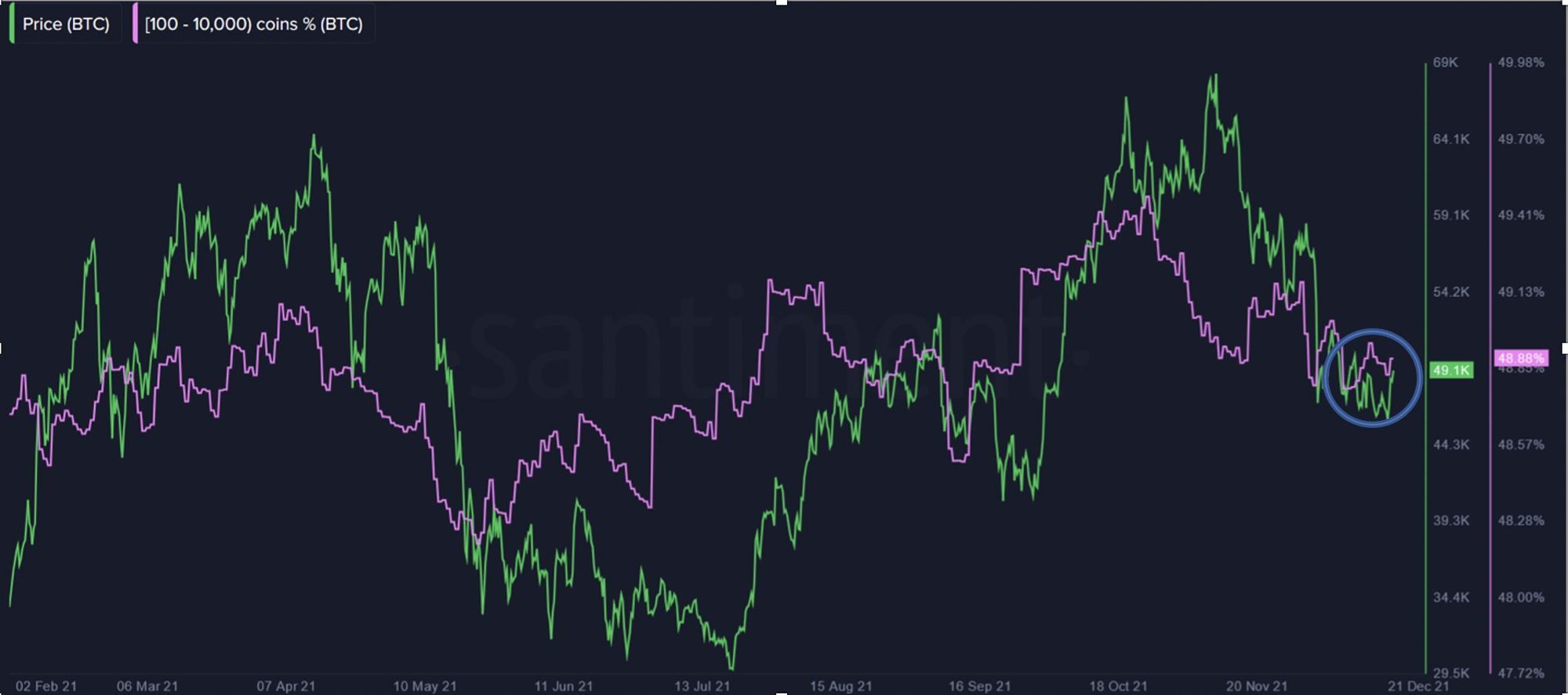 Bitcoin addresses holding between 100-10k Bitcoin have yet to show signs of renewed accumulation since the crash in early December 4th.