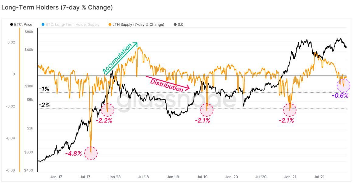To gauge whether we've entered a new macro phase, we use the metric below. This metric visualizes the 7-day change in the supply of LTHs. Historically, distribution phases have seen a 2% or more decline in LTH supply as indicated in red.