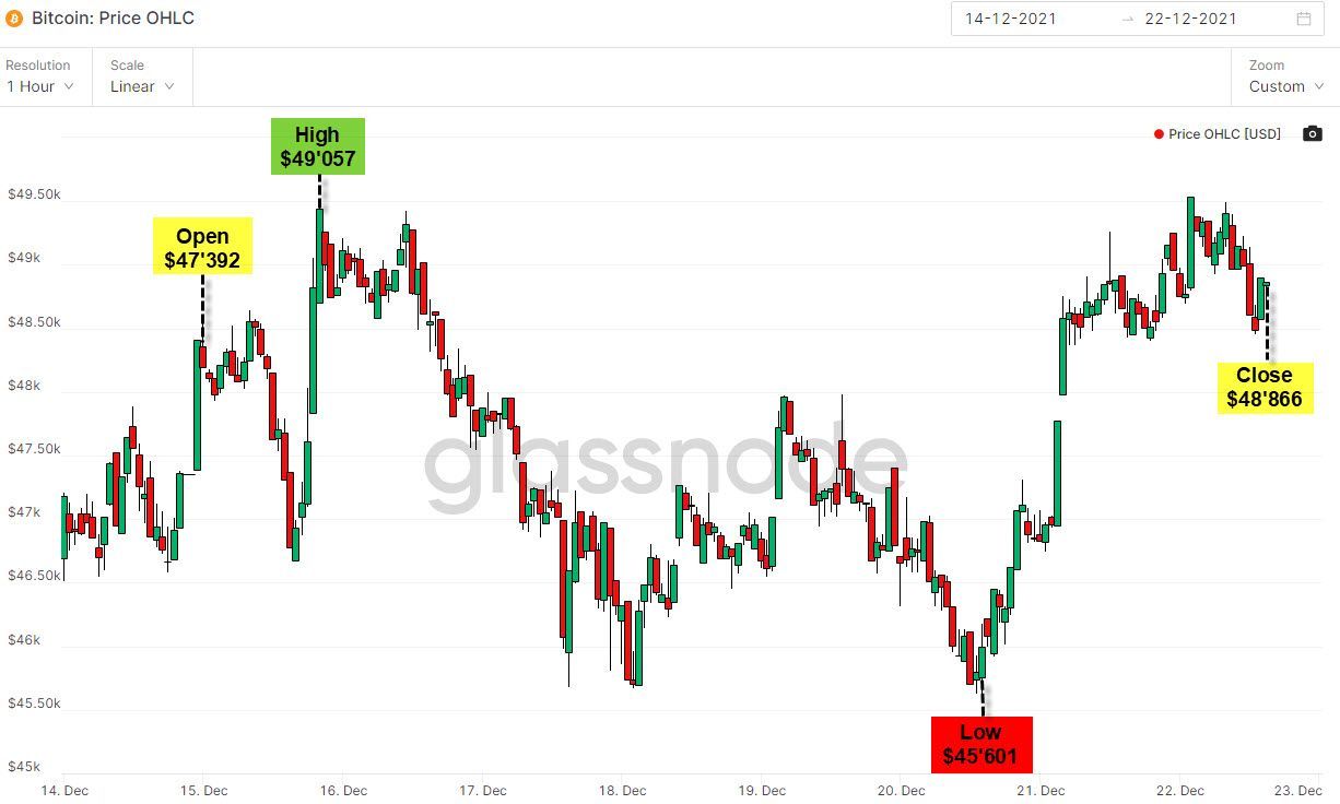 - Price of Bitcoin opened at $47.3k this week and closed at $48.8k for a weekly gain of approximately 3%