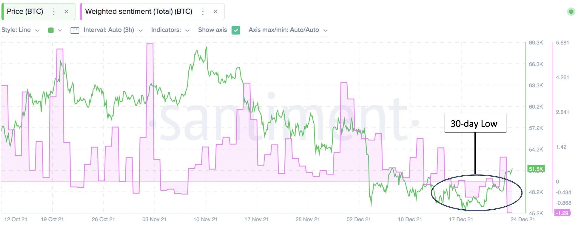 Social sentiment has continued to remain low and has in fact reached a 30-day low. This partly explains Bitcoin's climb back up to $49k as low sentiment on social networks often provide fertile ground for price recovery.