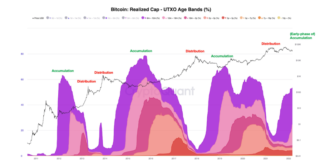- According to the metric, Bitcoin is currently in the early stages of its accumulation phase