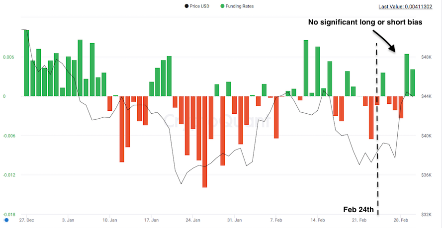 - There is currently no clear directional bias in the derivatives markets as funding rates have fluctuated from positive to negative in the last week