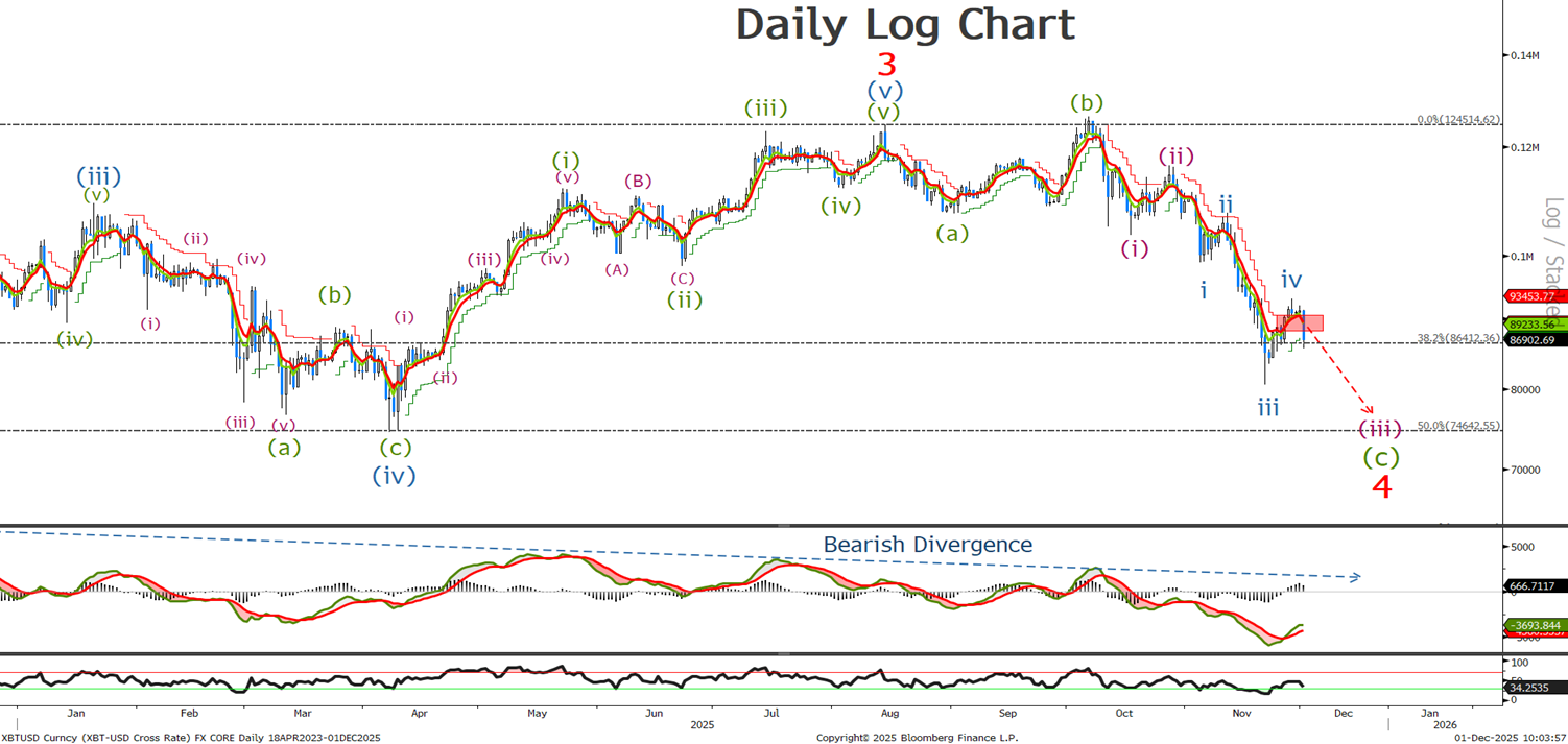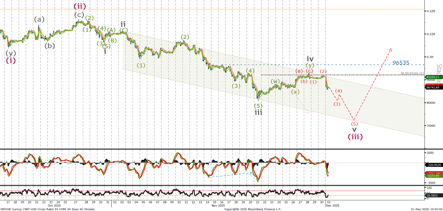Last time we said ‘It looks to me that we have further on the downside to go to complete wave (iii), lets look at the short term to see if the minor wave iv correction is over before the next sell off.’ We traded up to 93050 just above the red area highlighted and this mornings sharp sell off looks to confirm that wave v of (iii) for a new low below 80550 is underway , lets look at the hourly.