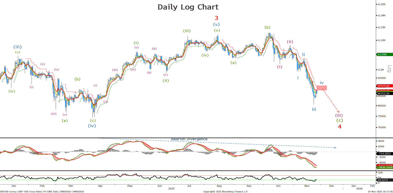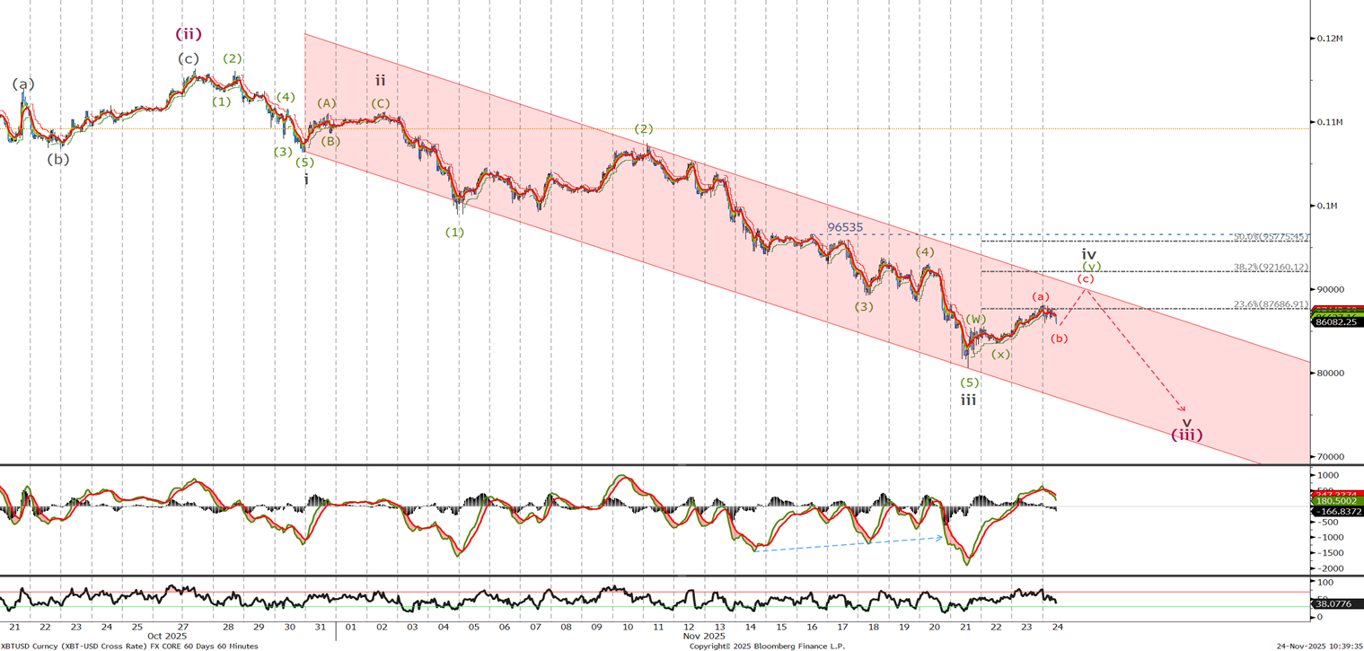 Last time we said ‘The new count is more bearish with wave (iii) of (v) underway with targets at 86.4K followed by my prefered target around the previous major wave (iv) low and 50% retracement level at 74650.’ It looks to me that we have further on the downside to go to complete wave (iii), lets look at the short term to see if the minor wave iv correction is over before the next sell off.