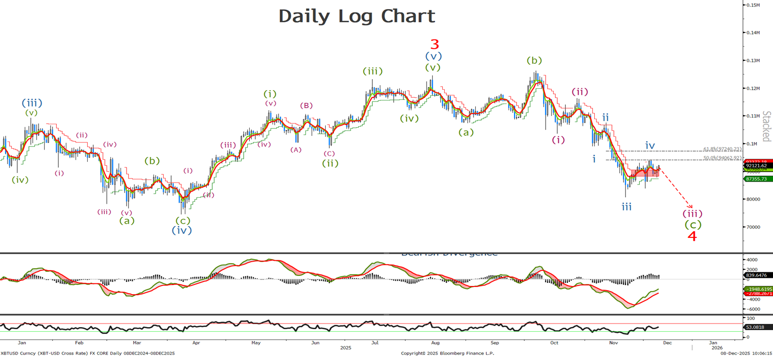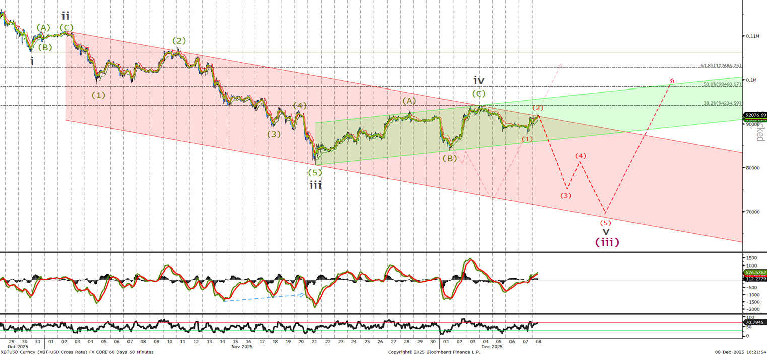 Last time we said ‘this mornings sharp sell off looks to confirm that wave v of (iii) for a new low below 80550 is underway ,’ We traded slightly higher and tested the 50% at 94063 and whilst below 99k we will look for BTC to trade lower below the 80k level. Add to shorts at 97.2K with stops at 99k or 107k for a longer term trade.