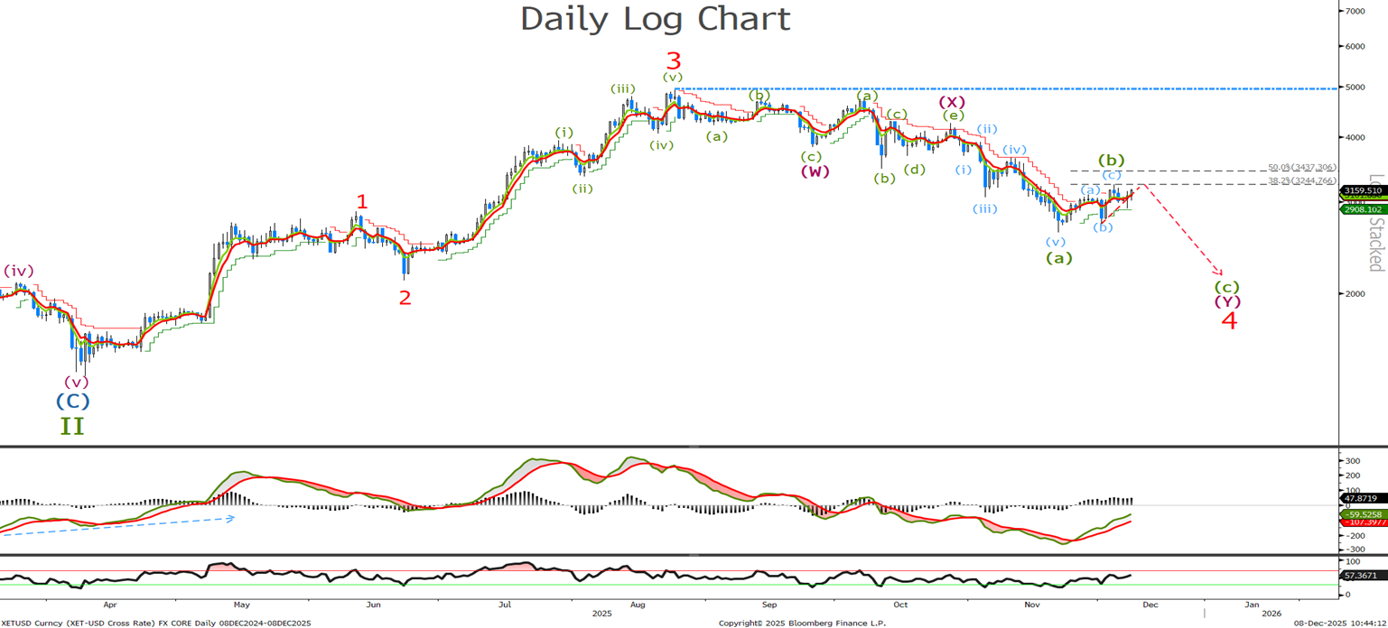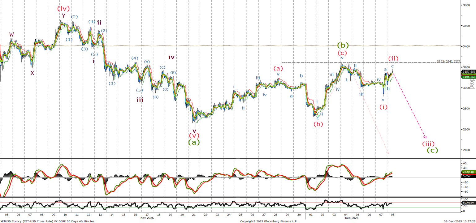 Last time I was looking ‘for a correction up towards the 3244-3437 level to complete the third wave of the wave (b) correction before another sell off in 5 waves lower to complete wave 4. Look to sell up there with stops on a longer term basis above 4200.’ We traded to 3240, inline with expectations and should see a sell off anytime soon. Sell again at 3430 and lower stops to the wave (w) low at 3827. Lets check the short term to see if signs that wave (b) has ended.