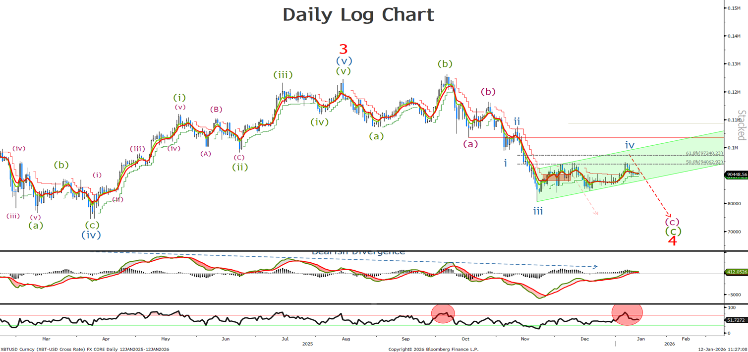 Last time we thought wave iv was on going and ‘ We remain bearish whilst below 103.7K stop level. I think we see a short term push towards the top of the channel before the sell off to at least below 80k.’ We instantly traded lower and I have relabeled the short-term chart with wave iv completing at 94785 before selling off. It appears that minor wave ii is complete so sell now at 90460 with stops above the high of wave iv or at the previously mention 103.7K.