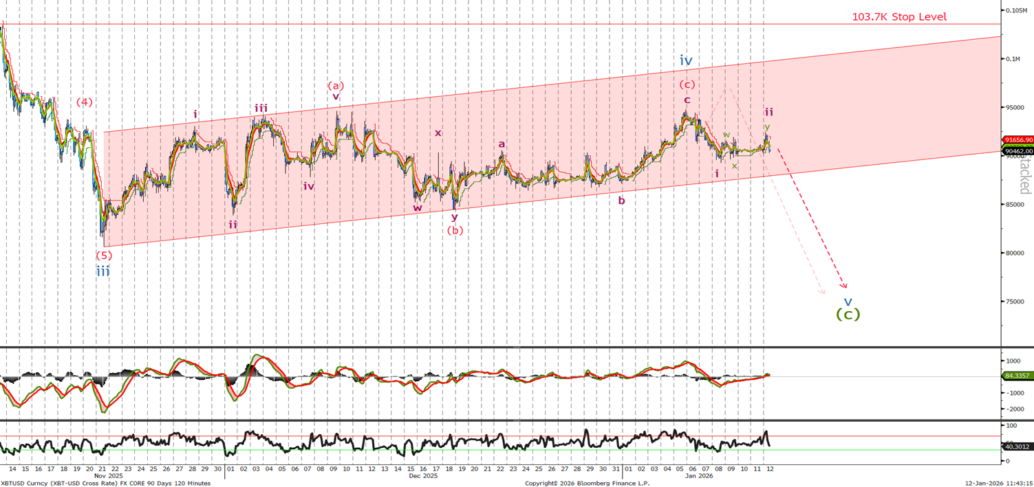 Last time we said ‘Look to sell at the 97K level and I would move my stops up to the wave (a) low at 103.7K. I will remain bearish on the BTC for a push towards the 80K level.’ The BTC has drifted off since the last update but no change in my underlying view, at this time, expect an acceleration on a break out of the channel.