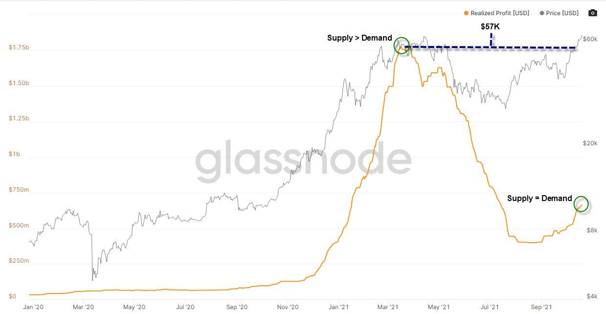 The realized profits metric expresses the amount of profits realized at a certain price level. This metric sheds light on the relationship between demand and supply when compared with price. If both metrics trend similarily, supply outstrips demand which usually causes a correction in price. Conversely, if realized profits are well below price levels, the demand is able to absorb supply and sustain upward price movement.
