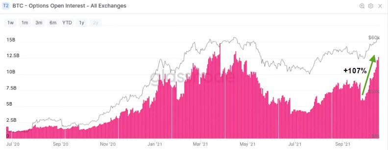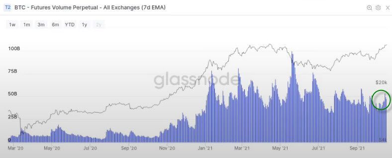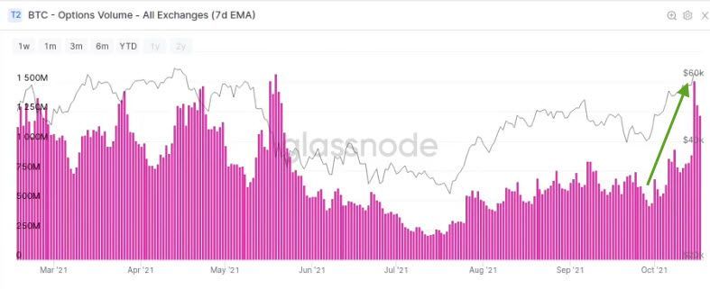 We established that there has been an increase in spending from LTHs, as they are slowly starting to sell their coins into market strength, and realize profits. Exchange outflows have decreased which isn't very constructive for prices. However, the metric is in equilibirum which is a positive sign given that prices have almost reached new all-time highs. There is an increase in leverage in the derivatives market as both options and futures markets have seen an increase in volume, notably the opening of long positons. These increases aren't large enough to pose a significant threat of a long-liquidation. All of these factors point to the market feeling bullish about prices skying high in Q4 of 2021.