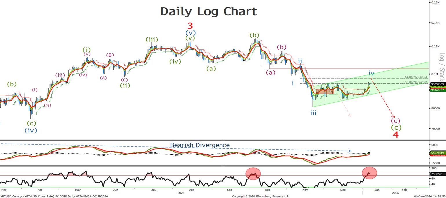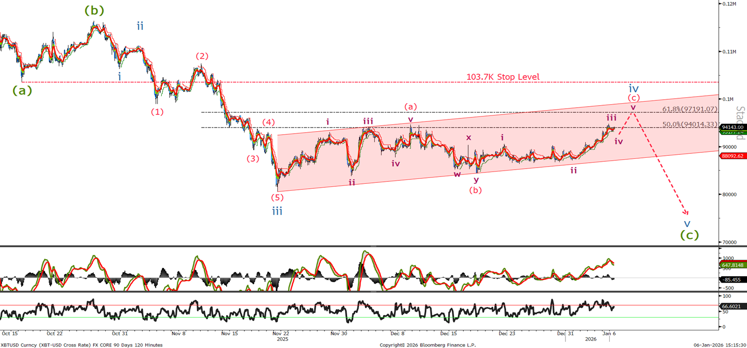 Last time we thought wave iv had finished and said ’I will remain bearish whilst below the 99k level , looking for an acceleration on a break below the 84k level. Towards the bottom of the channel with targets towards the 64k level.’ The correction has been on going but we remain bearish whilst below the now, 103.7K stop loss level. I think we see a short term push towards the top of the channel before the sell off to at least below 80K.