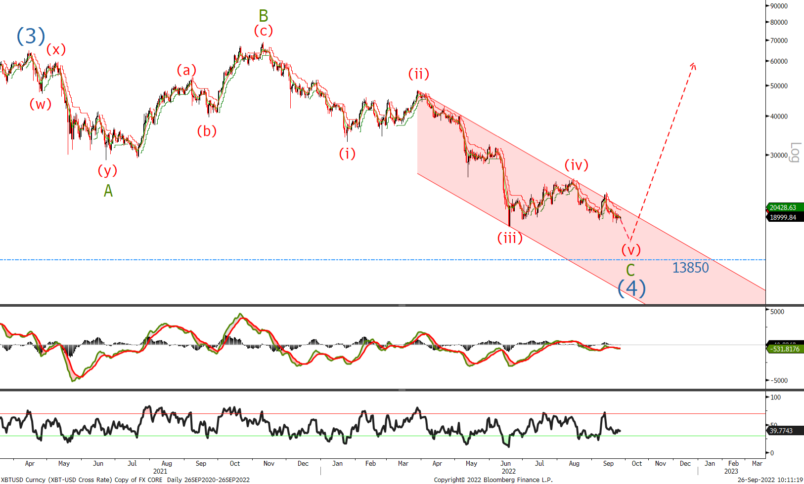 I am selling my position and going flat with an argument that BTC might also get caught up in the ETH merge. I would buy on a move back above 25300 , with a move below 17600 implying that another 3 waves lower is underway.’