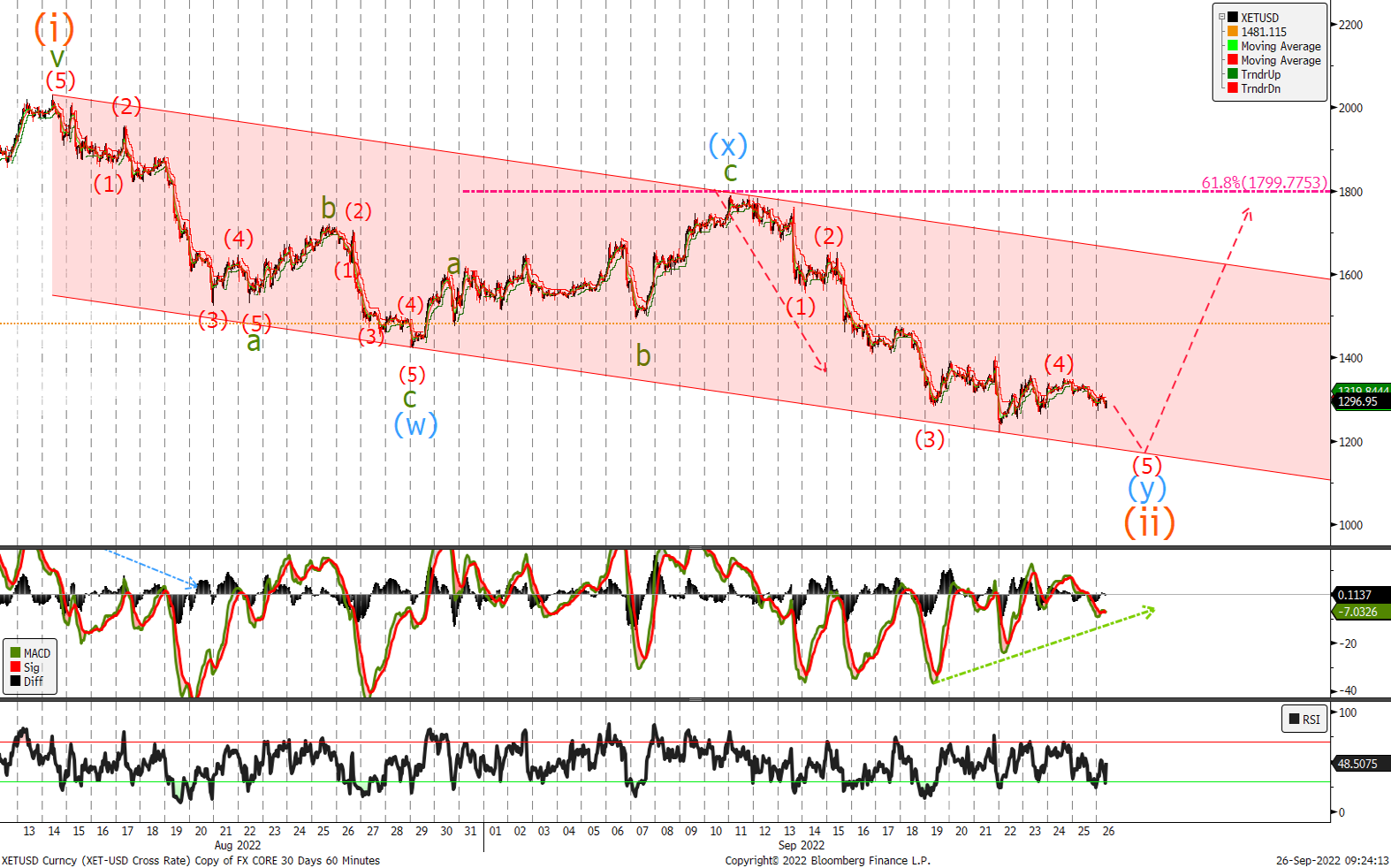 We traded to 1790 before selling off inline with expectations. Looking at the price action we can see that ETH is trading within the price channel and I expect to see one more new low below 1220 somewhere in the 1130/1180 area where we would buy , closing shorts and go long. Given the divergence in the MACD we expect a low very soon with a move back up above 1400 confirming wave (iii) higher is underway.