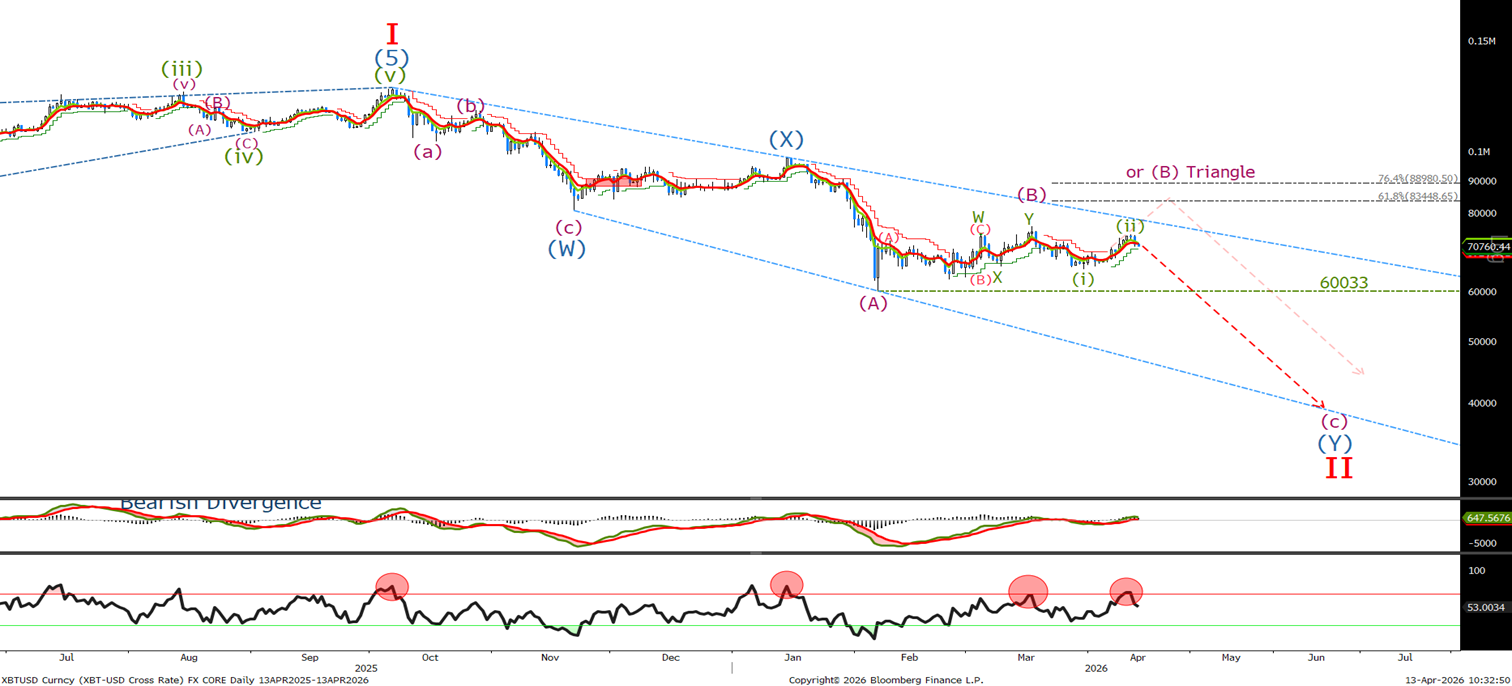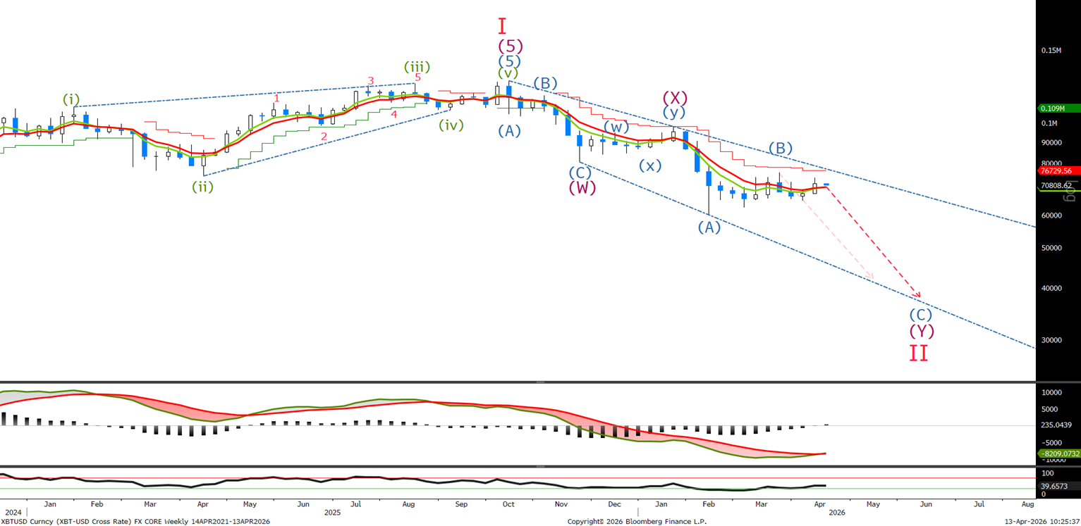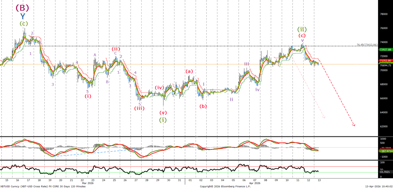 We got stopped on our short position, but our longer-term view remains bearish, so I am selling now at 70820 and will add at 71770 and 72160 with stops above last week's high at 73814.