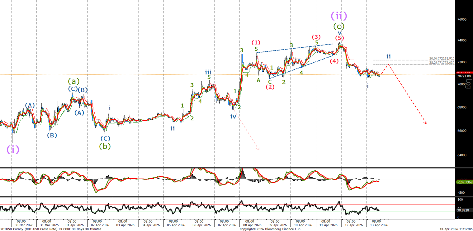 The correction I was looking for went slightly higher than expected but stopped just above the 76.4% retrace level at 73813, and whilst below the wave (B) high at 75999 I continue to look for lower. Let's look to the very short term chart to see if we should sell now or wait for a correction.