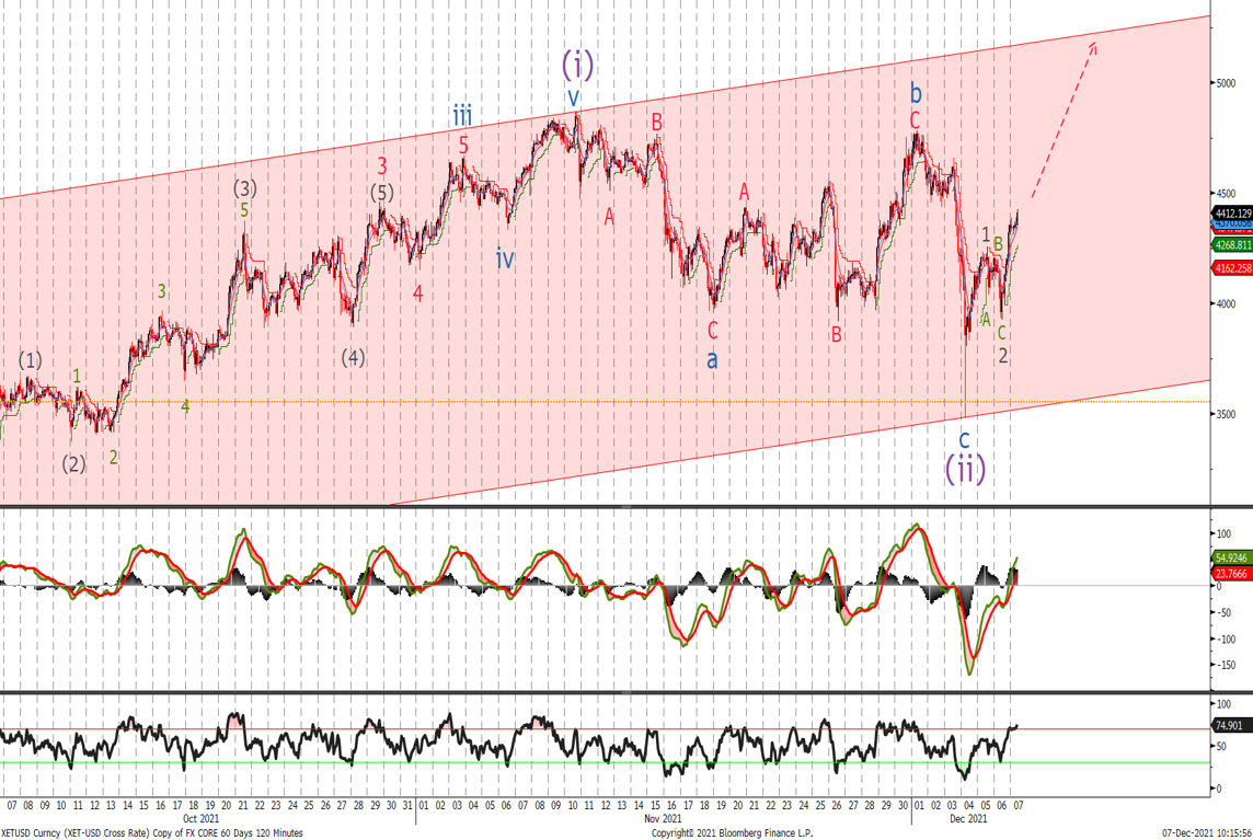 We traded up to 4'782 before crashing down to 3'482 so we remain bullish as we didn’t hit the 3'416 long term level. Looking at the wave count it is more likely than BTC, that a low has been seen for Ether. A move above 4'460 should confirm wave (iii) higher and we are looking for an acceleration to new highs above 5'000 going into year end. Look to buy on dips with stops at 3'416.