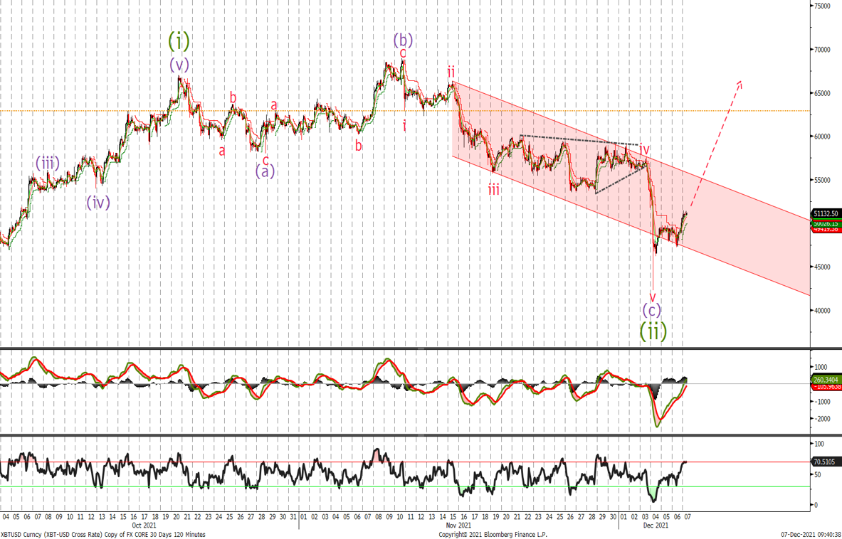 Last Friday's sell off stopped us out 44k with Bitcoin crashing down to 42'296. Currently we are trading at 51'200 and a move above 52'000 will be the first confirmation that a low is in place for the next leg higher in BTC. If going long now place stops below 46'800 with a break there indicating the sell off has further to go and a new low below last week would be on the cards. Overall we still would like to accumulate BTC with an acceleration expected on a close out of the channel followed by a break of 58'000.