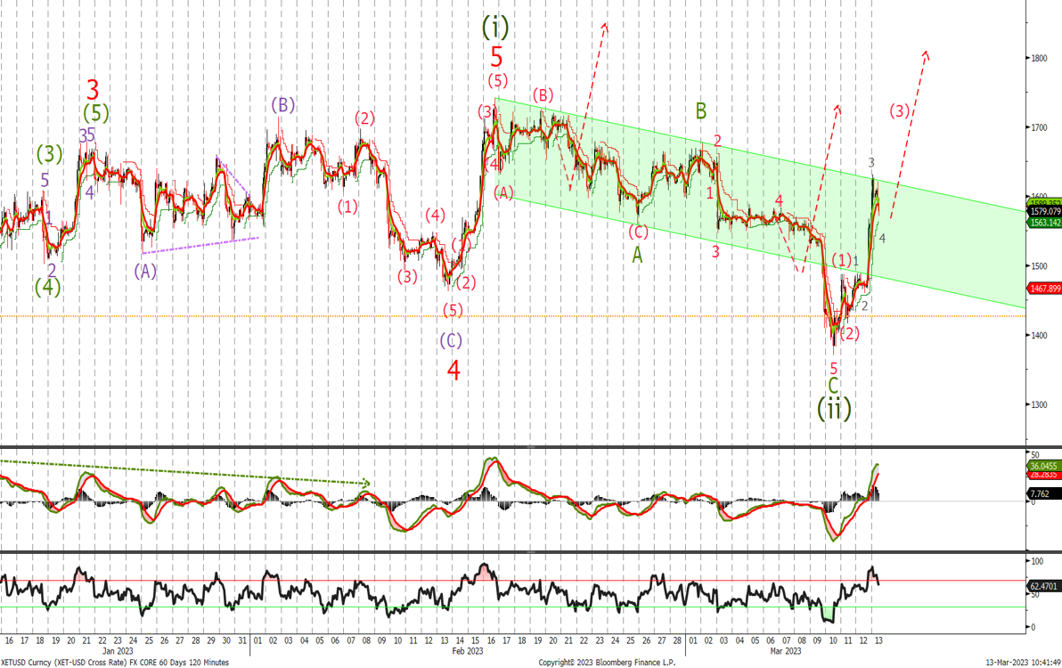 Allowing for the possibility of a deeper correction before wave (iii) gets underway. This will give us the opportunity to buy at $1'486, the 38.2% retracement level and the bottom of the channel but with a possibility even lower at $1'407. Lower stops now to $1'333. A move above $1'690 indicates next leg higher is underway.
