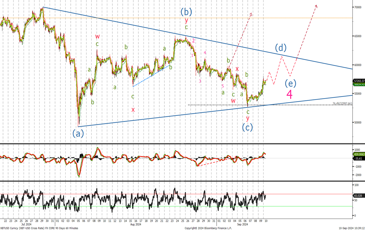 Last time we said ‘Looking at the short term chart it look like we will have one more break push lower and I would raise my buy level to 55500. Leave stops at the wave 4 low 49200.’ We treaded down to 52600 enabling us to buy slightly higher. I was too early calling what is now the wave (a) low the end of the correction and it appears , as is often the case we are tracing out a wave 4 corrective triangle. Buy now or on a slight dip and leave stops at last weeks levels a move back above 65k will indicate that wave 5 is underway.