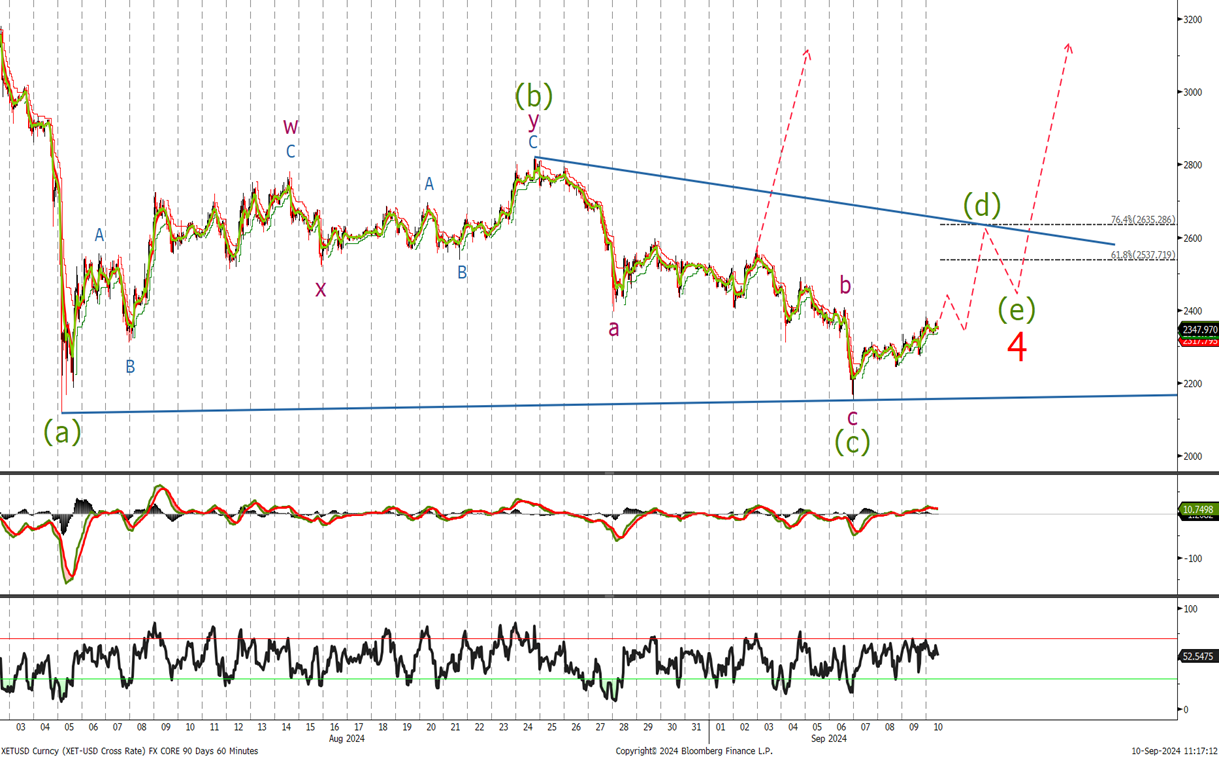 Last time we said ‘I like ETH higher and am buying some now Like BTC there is a possibility that we may trade slightly lower and will add at the 2448 and , 2370 and 2270 with stops at 2075.’ We traded down to 2152 so we are long and will leave stops at 2075. Like BTC I am showing a corrective triangle