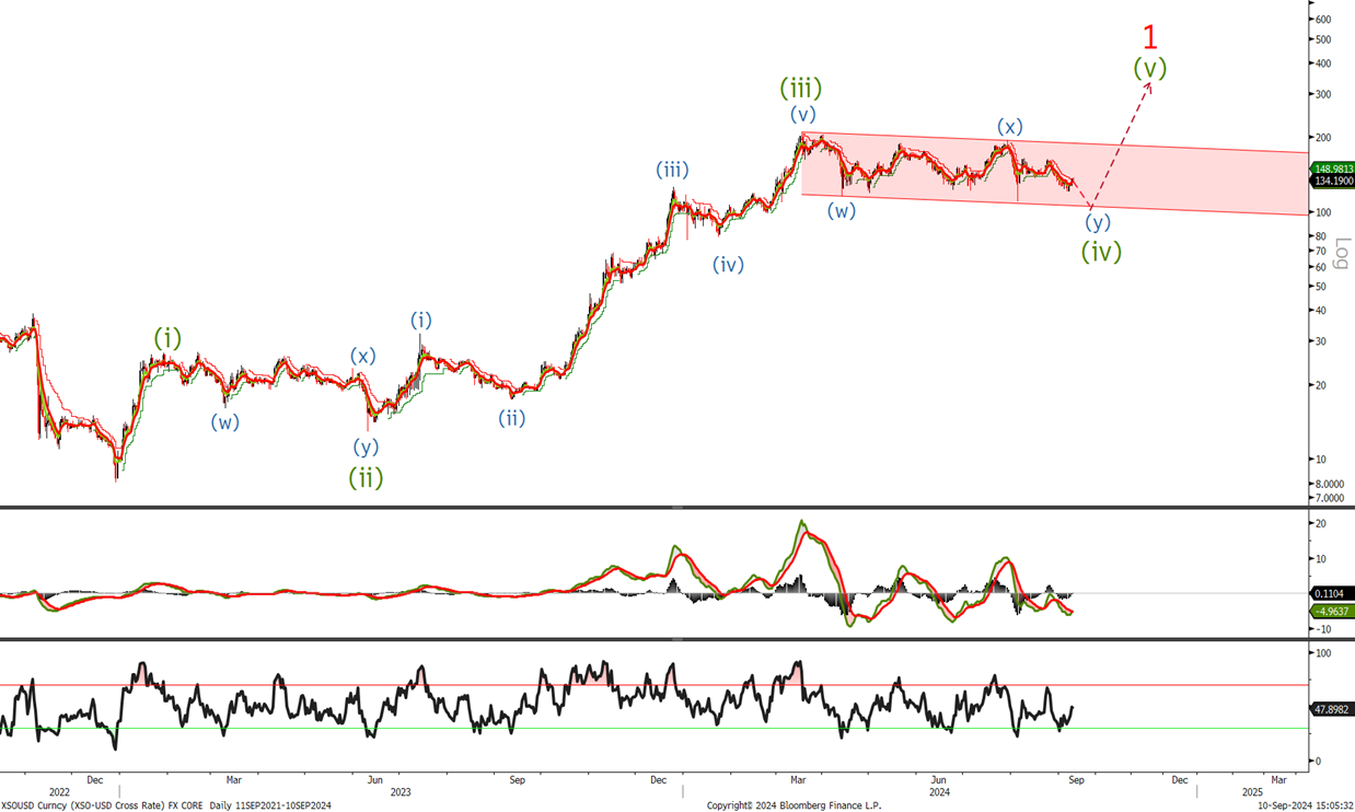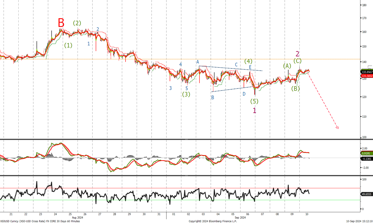 Looking at the hourly chart with a normal scale the wave count off the wave B high seems close to or has already completed the wave 2 correction which indicates a sharp sell off in wave 3 is imminent and a break below 126.9 will indicate that wave 3 lower is underway. This is inline with our longer term view and as this is my first week studying Solana I am happy to wait and see if the lower levels I am looking for materialize.