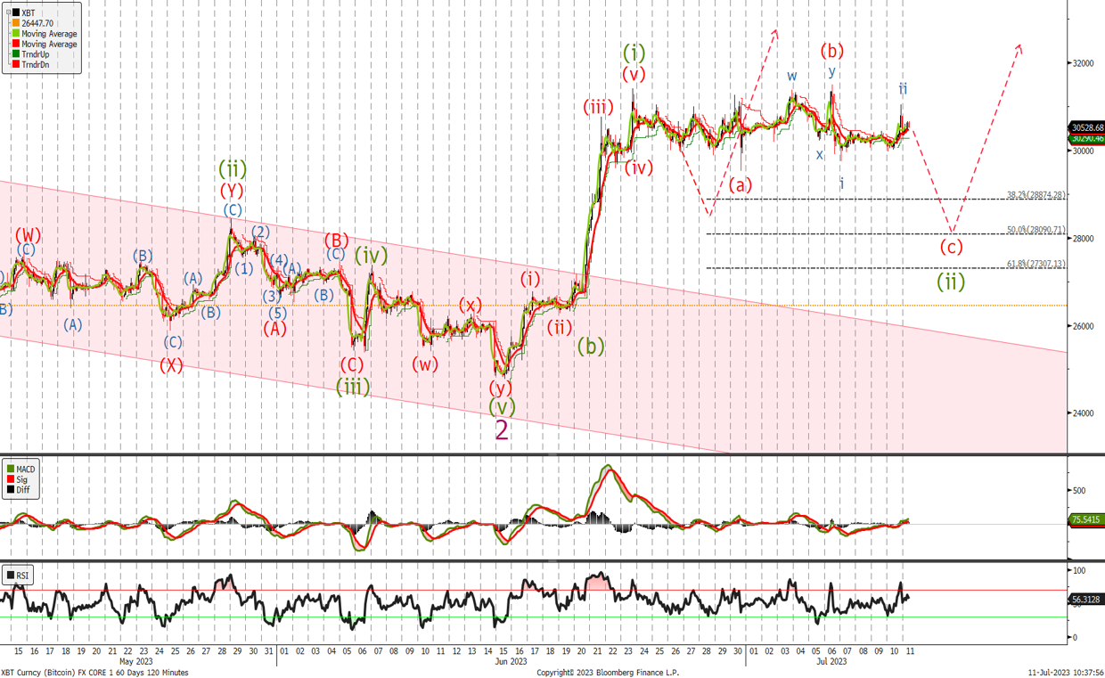‘It appears we have completed 5 waves up for wave (i) and are currently correcting in 3 waves. Look to buy at $28'900 and add at $28'100 with stops now at $25'800. Once the correction is complete we should see a sharp acceleration above 32k'