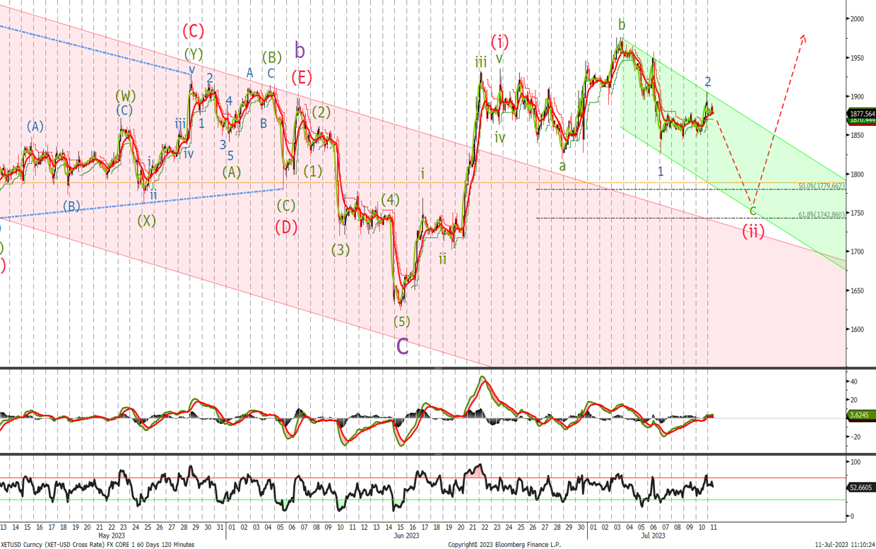 We traded down to $1'827 before correcting in 3 waves. Look for another sell off into the $1'780 – $1'742 area where we would buy with stops remaining at the $1'620 level mentioned last week.