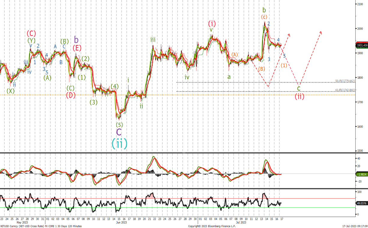 We traded to $31'818 before selling off sharply and it appears that the first leg down in wave (c) is underway. We continue to look for lower in the coming days and will use the same levels as last week to start accumulating a long position.