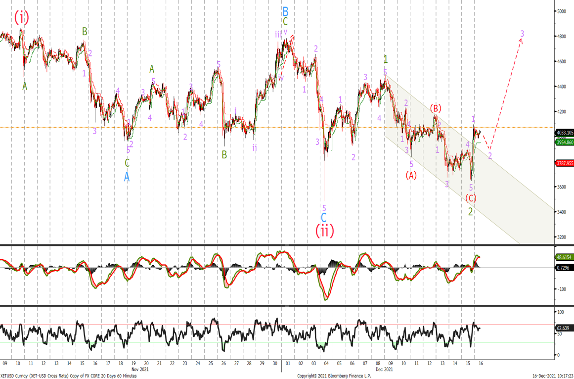 We spiked to $4'485 before selling off again yesterday to $3'644 completing a larger correction than we were expecting. The break out of the channel is the first indication that ETH is starting wave (iii) higher. Look to buy now or slightly lower around the $3'906 level with stops below the wave (ii) low at $3'482. A move back above $4'491 will confirm the move higher with next target situated in the $4'800/$5'000 area.