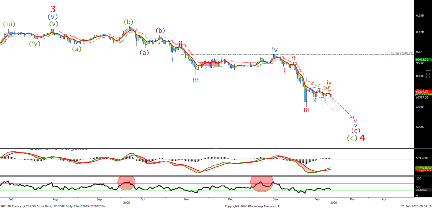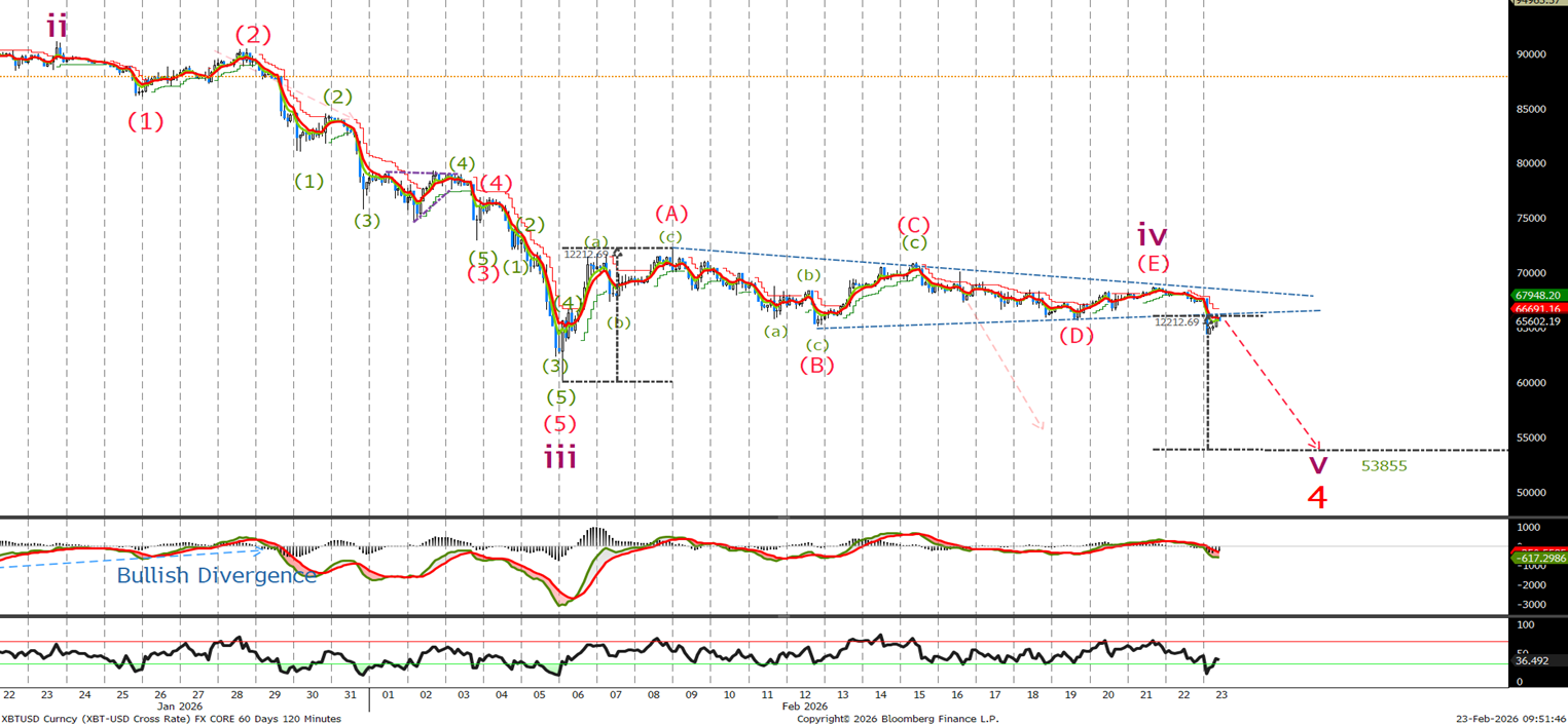 I have redone the short-term chart which clearly shows the corrective price action of the last couple of weeks. The overnight break lower now targets 53855. Wave IV triangles often travel the same distance as the depth of the triangle on breakout. We will look for a sell-off in 5 waves towards that level, followed by a test of the 50k level depending on the strength of the upcoming sell-off. This will provide us with an excellent buying opportunity, and I will update the short-term view when we get there.