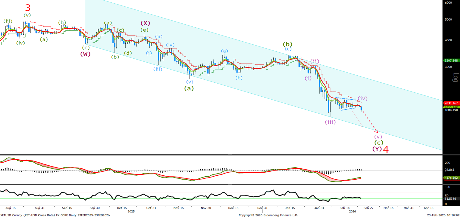 Like Bitcoin, the end of the wave (iv) correction appears to be over, with this mornings sell off and break out of the triangle confirming that the final legs lower are underway. Lets look to the short-term chart to see the target levels to the downside.