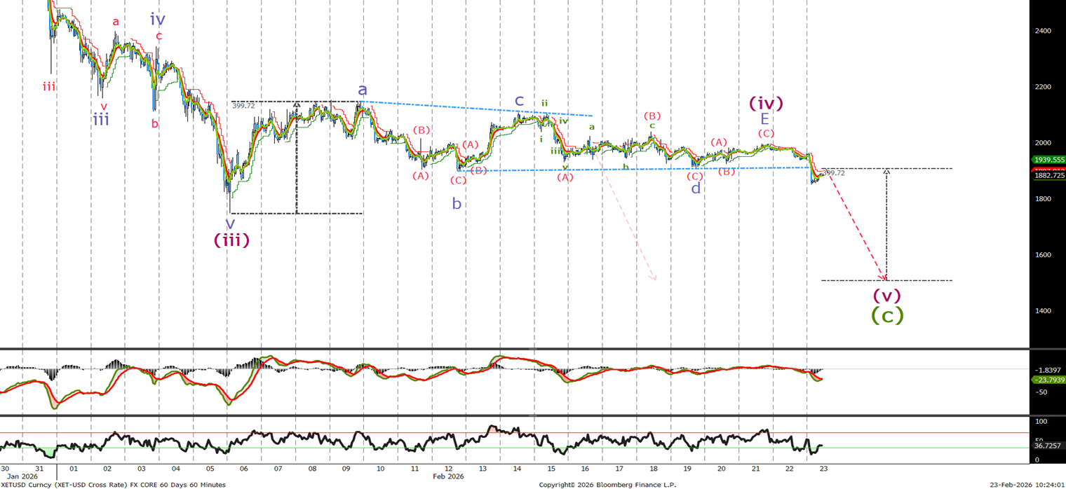 Last time we said ‘Looking for 5 waves lower in wave v of v to complete the larger wave 4 correction.’ We range traded in what I am now calling a wave iv triangle correction. This morning's break of the wave B low confirms that the final 5 waves lower are underway.