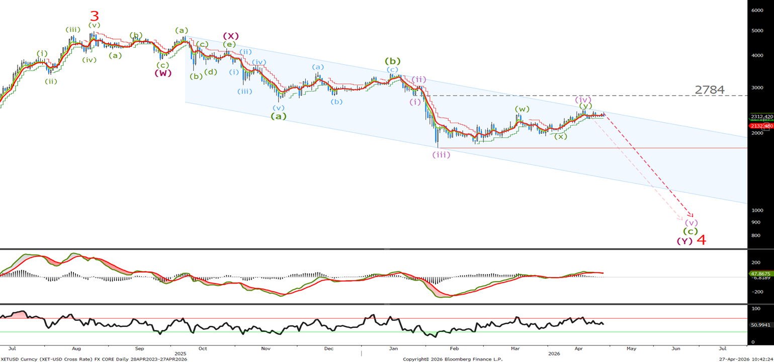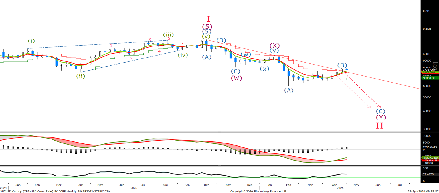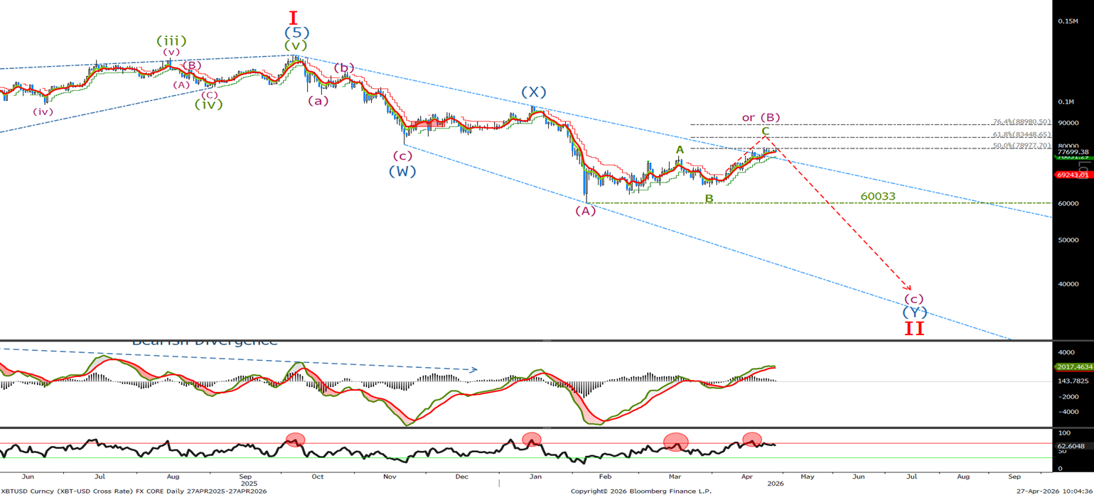 Last week we said, ‘We have tested up to the top of the channel and just short of the 50% retrace level at 78977. I am happy to sell at the current level and add at 84.4k and 89K with stops remaining above the wave (x) high.' Since the last update the 50% retrace level has been tested several times with a new high this morning at 79488. No change in the view so if not short I would look to sell on a daily basis.