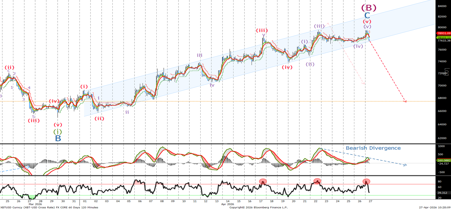 Last week we said 'it appears we have to make a new high above last week's wave (iii) 78343. Look to sell on rallies at the levels mentioned in the daily chart.' This morning we made a slight new high before sharply reversing . Given the divergence in the MACD, I believe this slight new high is the end of wave (B). A 2-hour close below the channel followed by a close below minor wave (iv) at 77181 will confirm that wave (C) to new lows is underway.