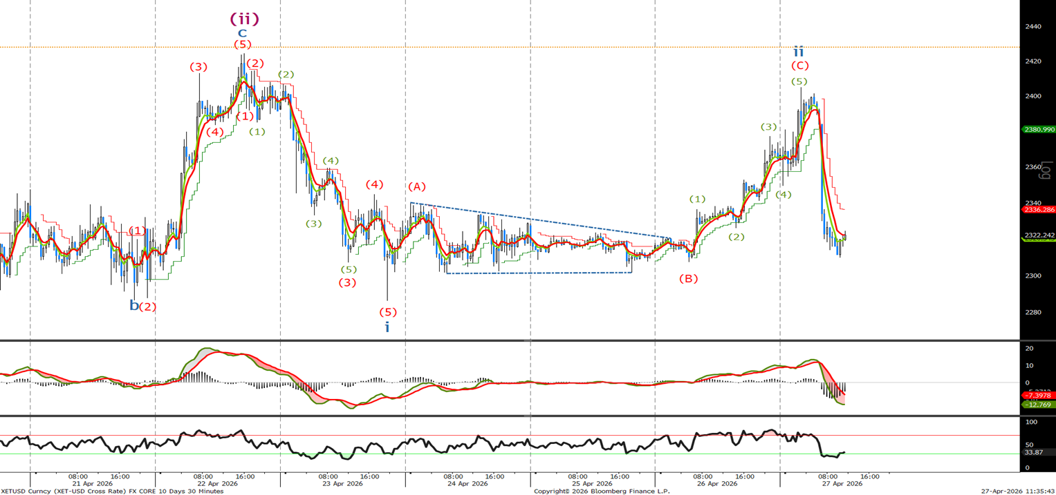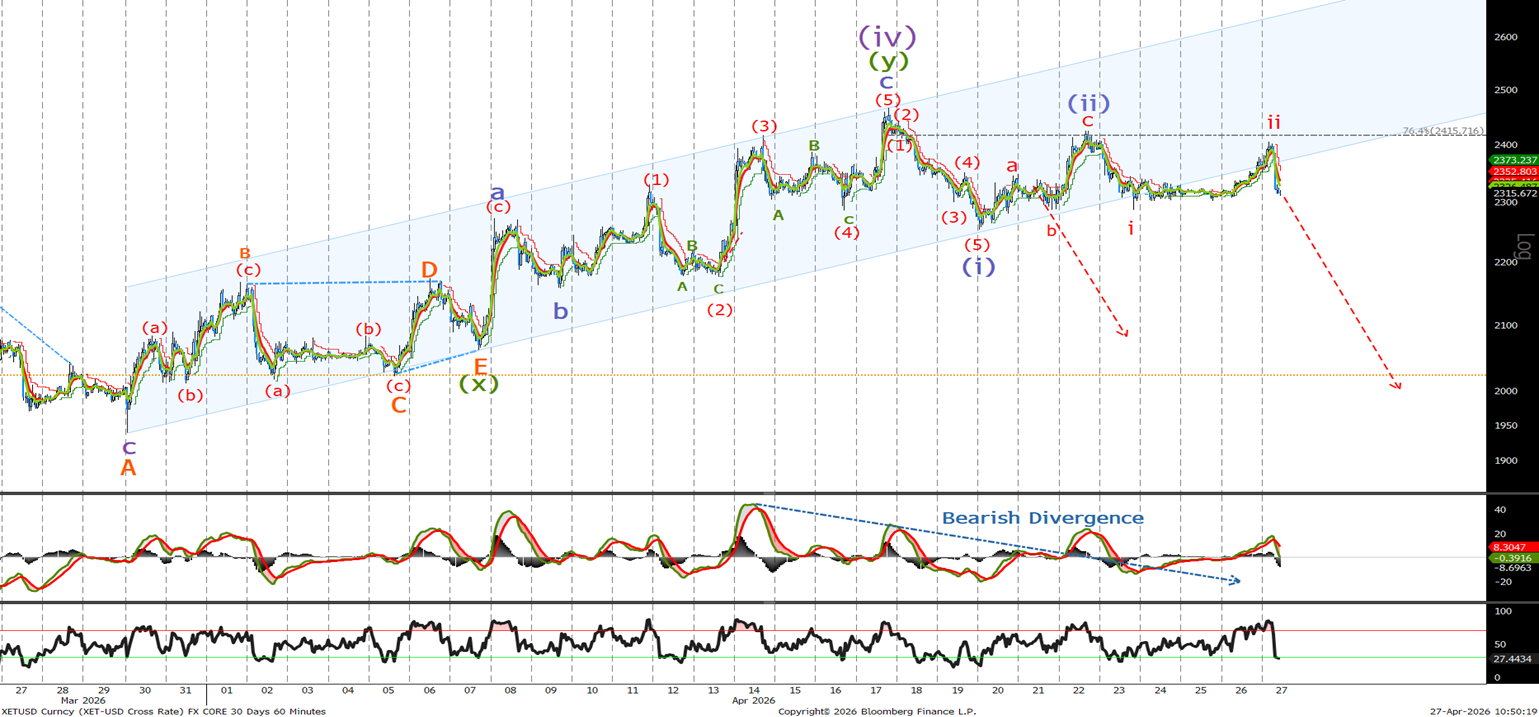 Looking at the hourly chart, you can see we retraced back to the 76.4% Fibonacci level to complete the 3-wave correction for wave (ii). I am happy to stay short , if not short sell now with stops above the wave (iv) high at 2465. Let's break this down into the very short term to see the price action.