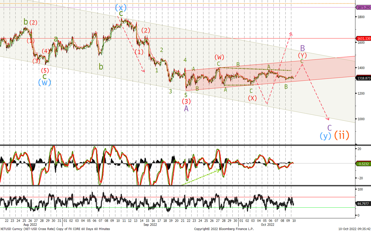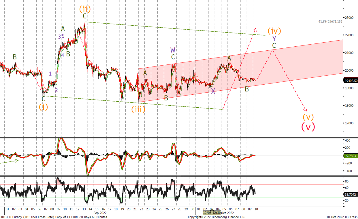 We said that wave (iv) had completed last week, but the subsequent price action indicates that a larger zigzag correction is underway. Look for a move up towards the $20'500-$21'000 area where we would sell with stops remaining at $22'800.