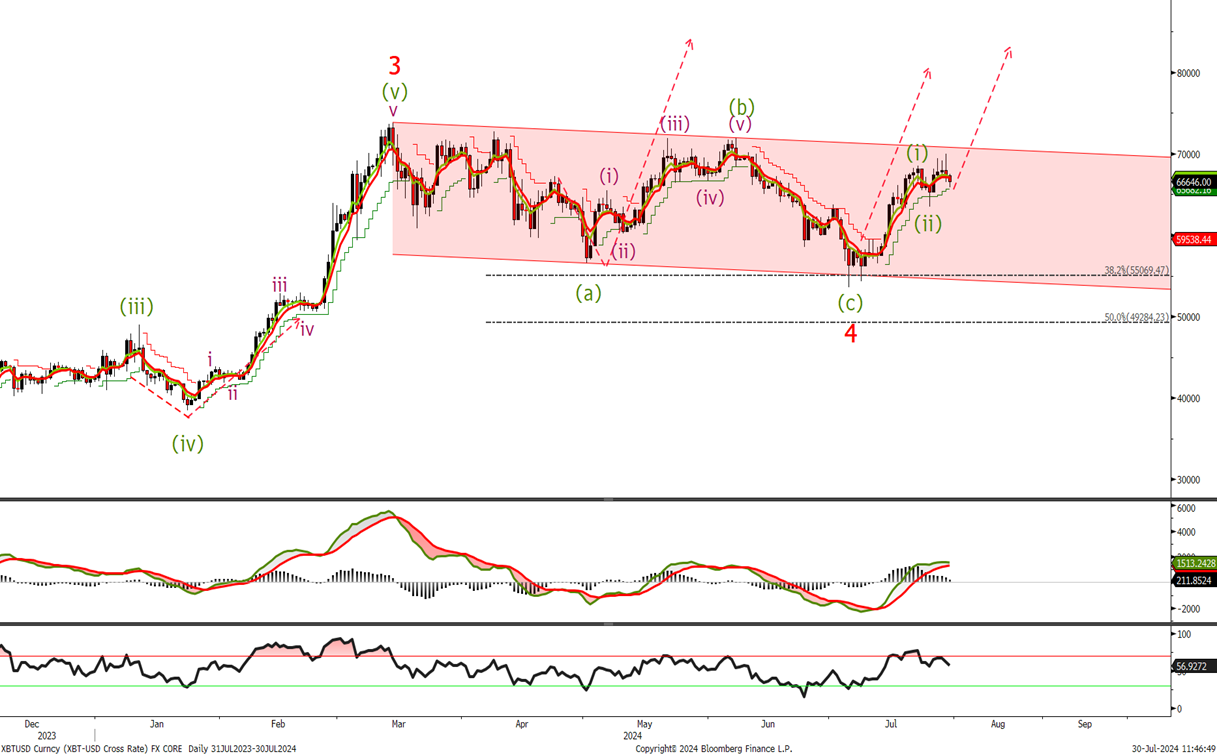 Last time I said ‘Well we got stopped on our longs at 55k So I am rebuying the long back at current levels with stops below 53k’ and I am very happy we did as it has traded higher since. The first leg of wave (iii) looks complete and I don’t see much further downside. Happy to buy BTC now and add at 63k raising stop loss to 58 k in the short term . Only a break of wave 4 low will negate the bullish trend.