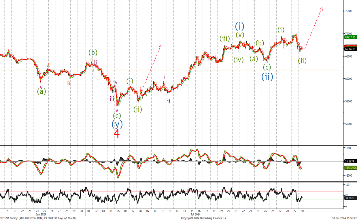 Last time we said ‘We traded down to 53600 . it doesn’t negate our longer term bullish view.’ You can move stop losses up to the wave 4 low on long positions as the BTC appears to have completed it correction in the long term and use any dips to buy. So s last time lets look at the short term to see where this buying opportunity may arise.