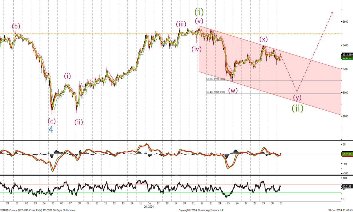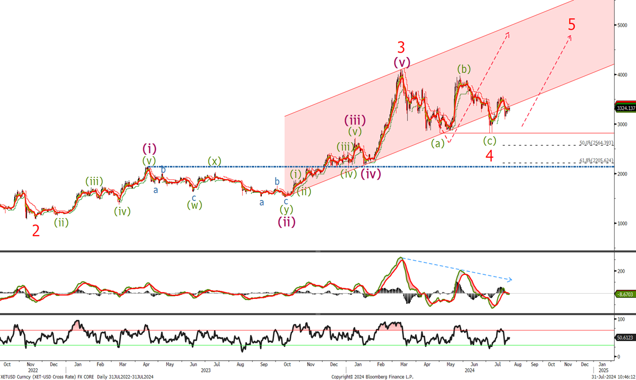 We still haven’t broken above the 3500 level we were looking for to confirm the next leg higher in the coming weeks. I think we are currently correcting lower and should see a move back into the 3000 – 3100 level. Look to buy down there with stops at 2770.