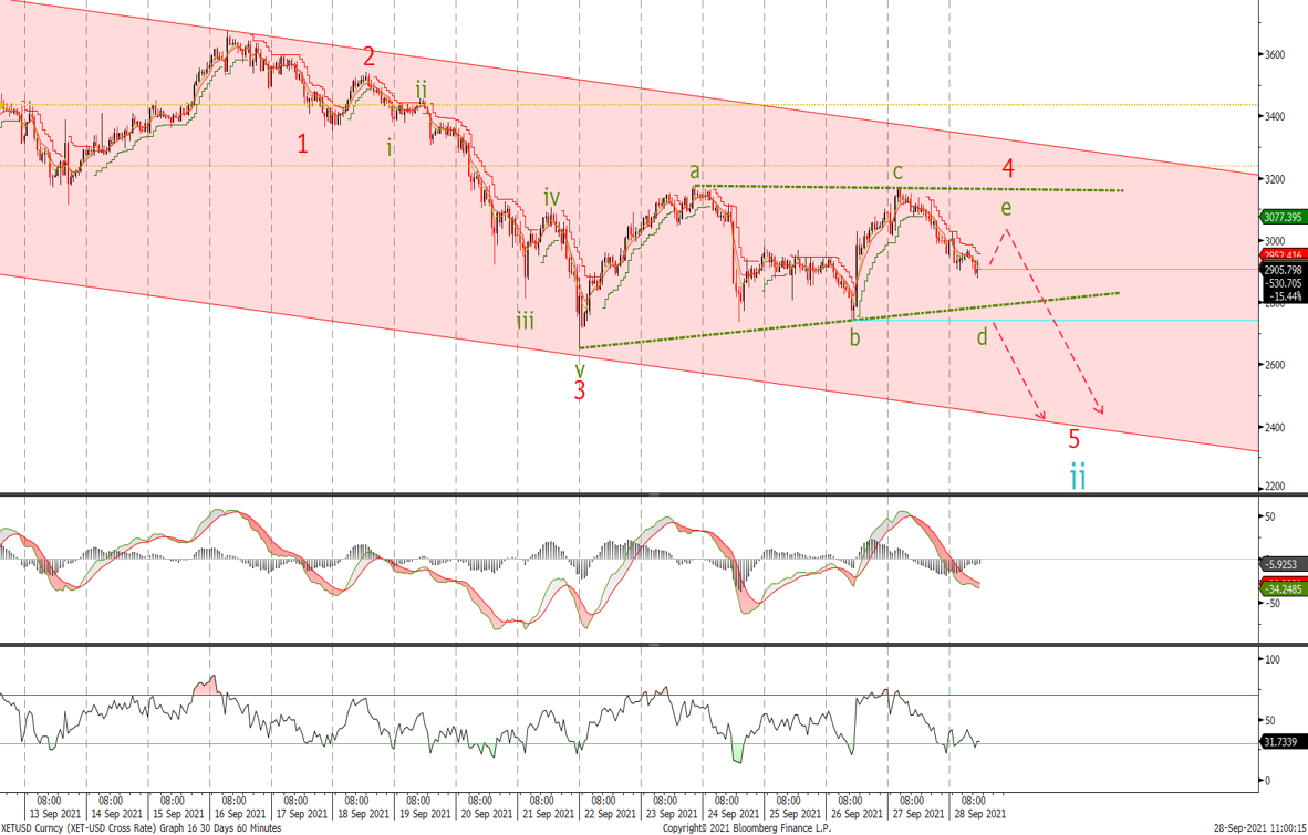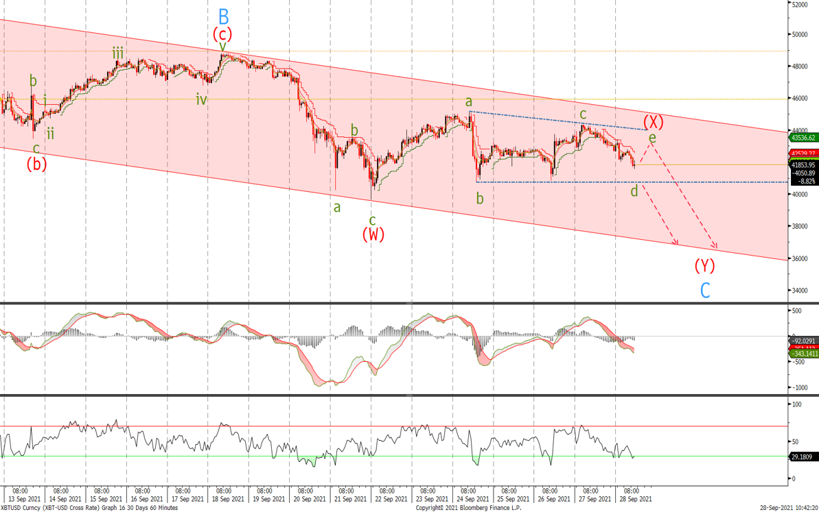 Last time we sold at 43'330 and started to ‘to buy around the 40'800 level followed by 38'000 expecting to see a low anytime for Bitcoin before the next what should be an impulsive move higher in wave 3’. Since the low we have bounced to 44'350 and currently selling off, it appears that we could be tracing out a triangle correction and whilst below 45'100, I will look for break of the wave b low at 40'735 for a push towards the bottom of the channel to complete the major correction before the next leg higher.
