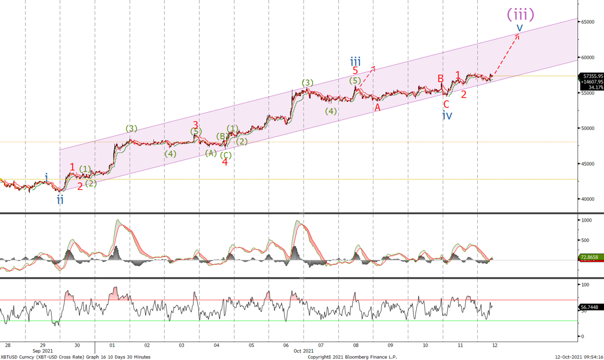 Following Thursday's update, we have continued to grind higher within the channel and are looking for an acceleration higher towards the top of channel to complete wave (iii). Look to buy on dips with stops below 54'396, the wave iv low. One target to the topside is 63'613 and this move could be sharply higher to new highs above 65'000.