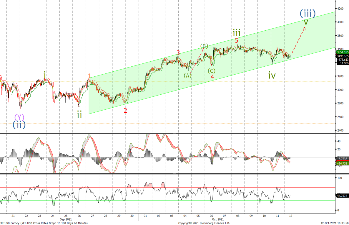 Last week we bought at 3'323 before trading to 3'369 and like BTC, we have been trading nicely within the channel. I would add to our position now at 3'500 and again at 3'285 with stops below 3'162. In the very short term it appears that we have completed the first wave of wave v higher. With an initial target at 3'897 followed by 4'024 and the top of the channel.