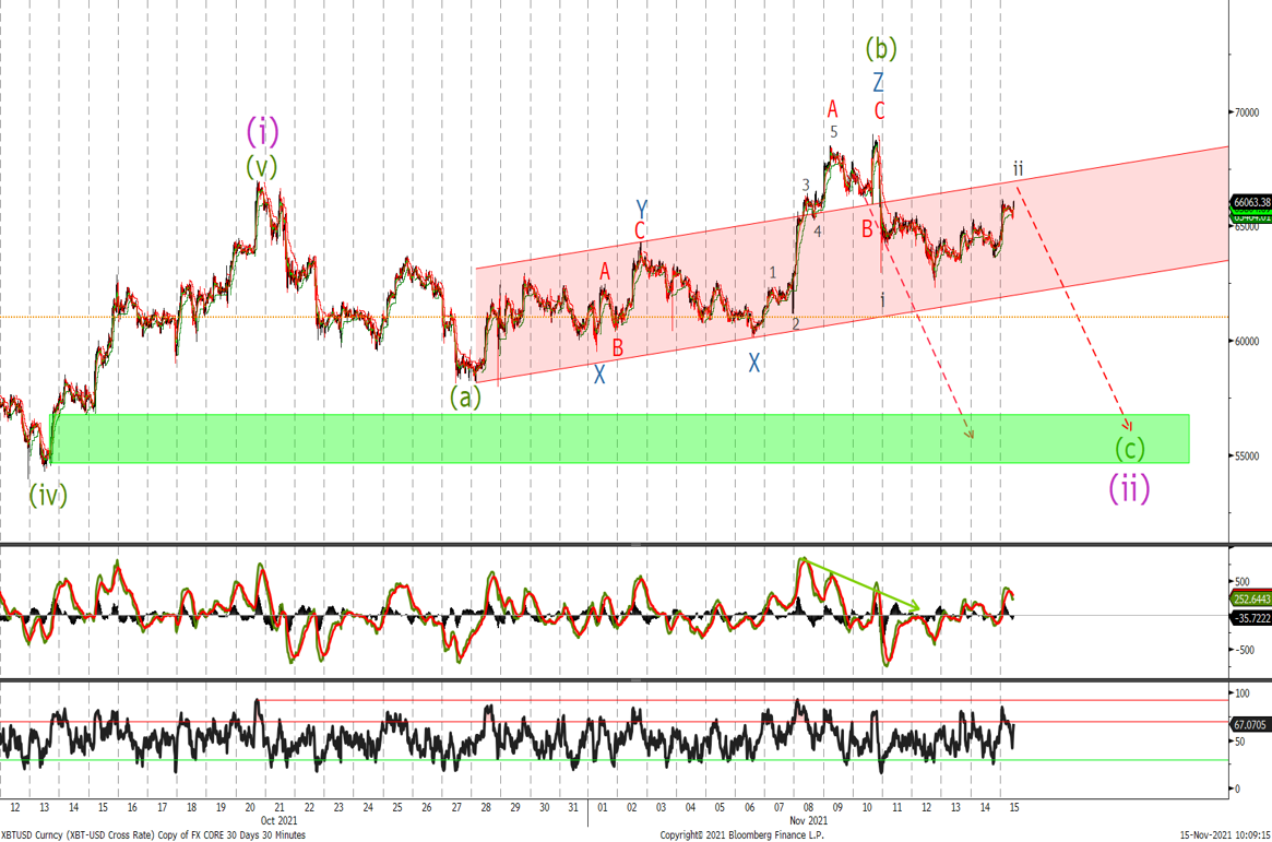 ‘We can count 5 waves up since the wave 4 low and a move back through 65'200 should see an acceleration to the downside. I am sticking with an expected correction lower with daily momentum showing bearish divergence. Once we break the wave X low, we target the area of the previous wave (iv). And would look to start buying for the next major impulsive wave (iii) higher.’