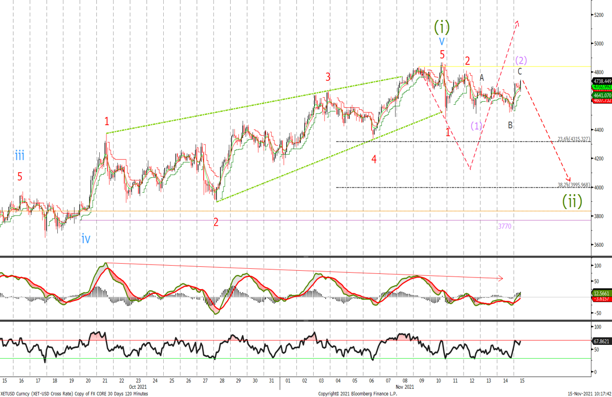 ‘Given a similar divergence pattern in the momentum indicators to BTC, I would start to lighten up on the position as I can now count 5 waves up. It does not mean that we will finish wave (i) immediately with possible targets to the topside at 5'062 and 5'155. Once wave (i) completes we will be on the look out for a 3 wave correction to the downside with support expected in the 3'770-3'995 area. We would use this opportunity to buy more ETH.’