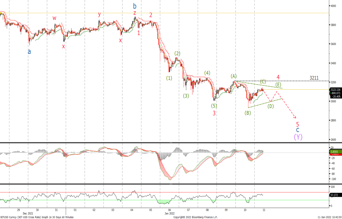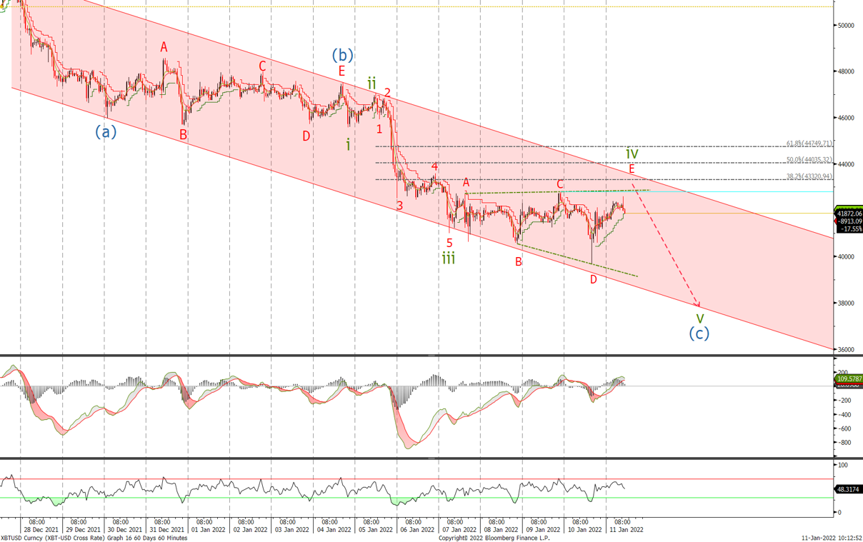 The sell off from the wave C high at $42'791 appears to be in three waves which keeps the bearish trend intact. It looks to me as if we are correcting in a wave iv expanding triangle and should see a new high above wave C. Expect resistance at the top of the channel and the 38.2% retracement level at 43'320, which is also the area of the previous wave 4. We will look for the sell-off in wave v in 5 waves to signal the buy area with a move up through 47'500 confirming the sell-off is over.
