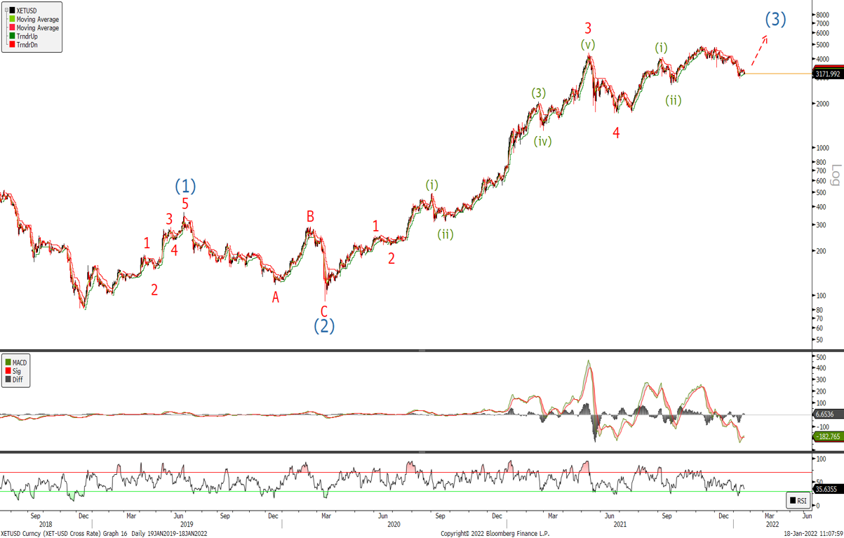 The long term logarithmic chart for Ether shows a similar pattern to BTC. Whilst above $2'600 we will look for ETH to trade higher. A break below could indicate a test of the $1'700 level but lets look at the short term chart to see if the correction off the November highs is in place.
