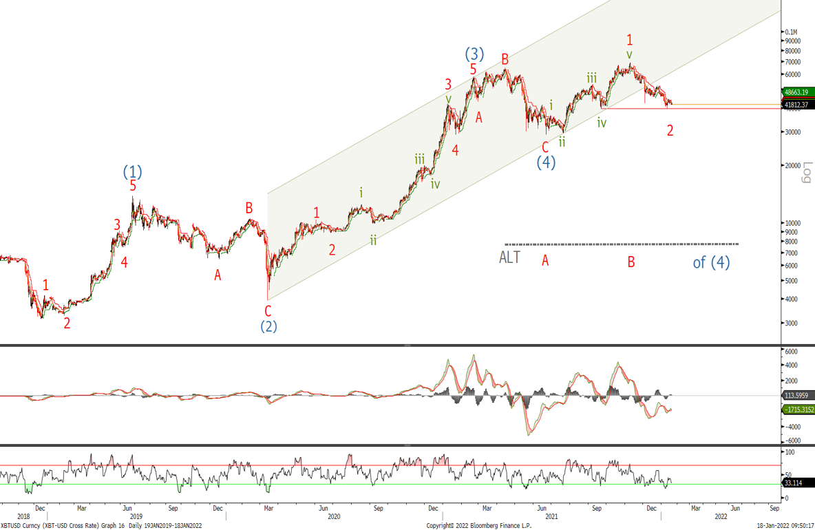 I am showing the long term logarithmic chart of Bitcoin going back to the start of this leg higher. We are looking for a low to occur soon to complete the wave 2 correction which should find support around the previous wave iv at $39'620.