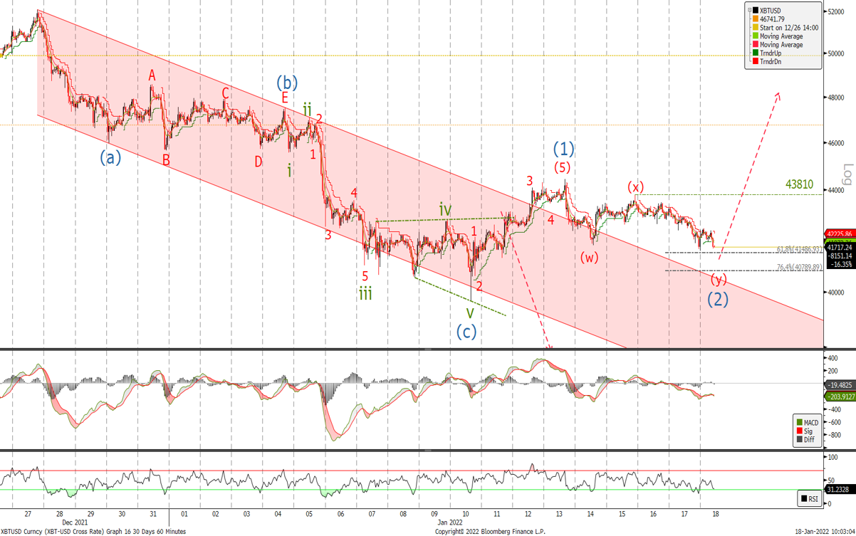 I would like to bring your attention to the alternative scenario which calls for a larger wave (4) correction that could take the form of a triangle (often seen in a wave 4) that could see us trade in a large sideways pattern for the year or take the form of a zigzag to new lows below $29'000 to complete the larger wave (4).