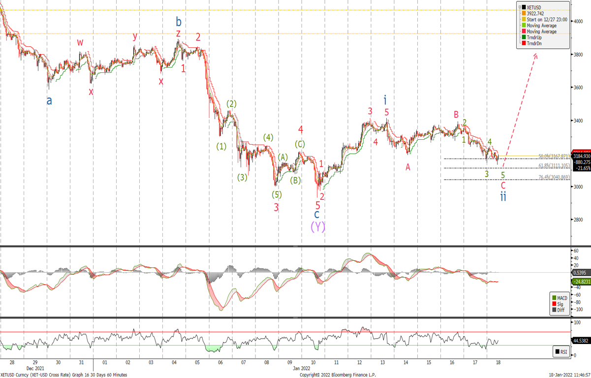 Looking at the short term chart we have completed or are close to completing the wave ii correction and look to buy in the $3'040 / $3'140 area where several retracements are situated. A break of $2'900 will negate the view but I will remain bullish until we break the longer term support level at $2'600.