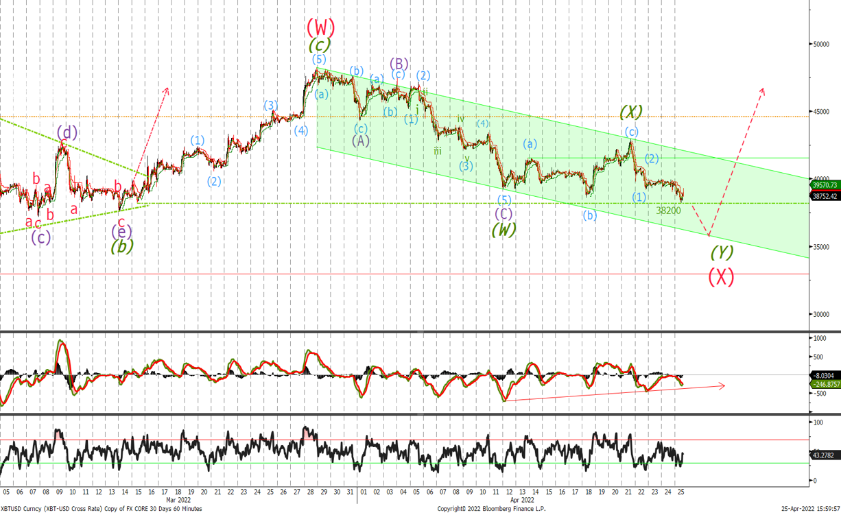 It does not negate our longer term bullish view, but we will call for a larger correction with support at $36'300 which is the bottom of the channel followed by $34'060 where wave (y) is equal in length to (w).